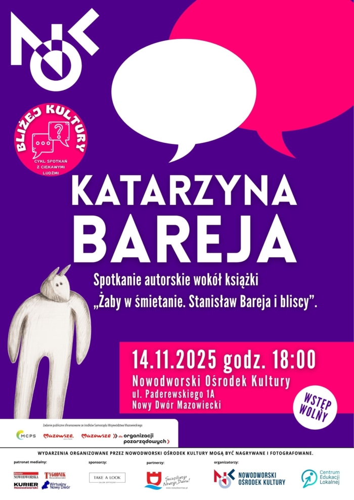 Nowodworski Ośrodek Kultury i Stowarzyszenie CEL – Centrum Edukacji Lokalnej, 14 listopada, w ramach cyklu „Bliżej kultury”, zapraszają na wyjątkowe spotkanie autorskie z Katarzyną Bareją – córką Stanisława Barei, filmoznawczynią i psychoterapeutką.