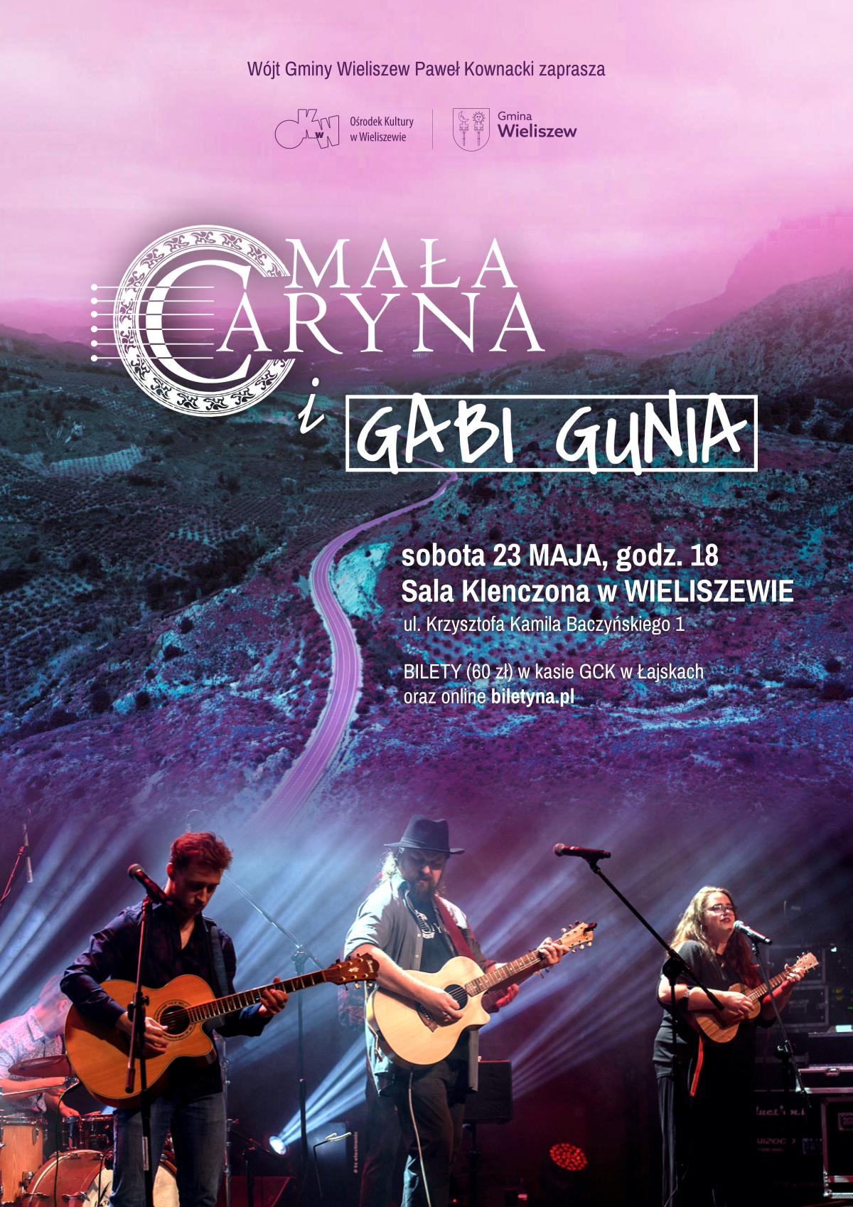 Miłośników muzyki folkowej, piosenki turystycznej, poezji śpiewanej / piosenki z tekstem, zapraszamy do Wieliszewa w sobotę 23 maja o godz. 18. W programie „pieśni ludzi drogi”, piosenki autorskie Łukasza Nowaka i Gabi Guni, tłumaczenia zagranicznych piosenek folkowych oraz aranżacje najpiękniejszych, starannie wyselekcjonowanych utworów muzycznych. Niezwykły kontakt z publicznością oraz umiejętności muzyków sprawiają, że koncerty Małej Caryny na długo zapadają w pamięć, o czym niejednokrotnie mogła przekonać się publiczność w Sali Klenczona.
